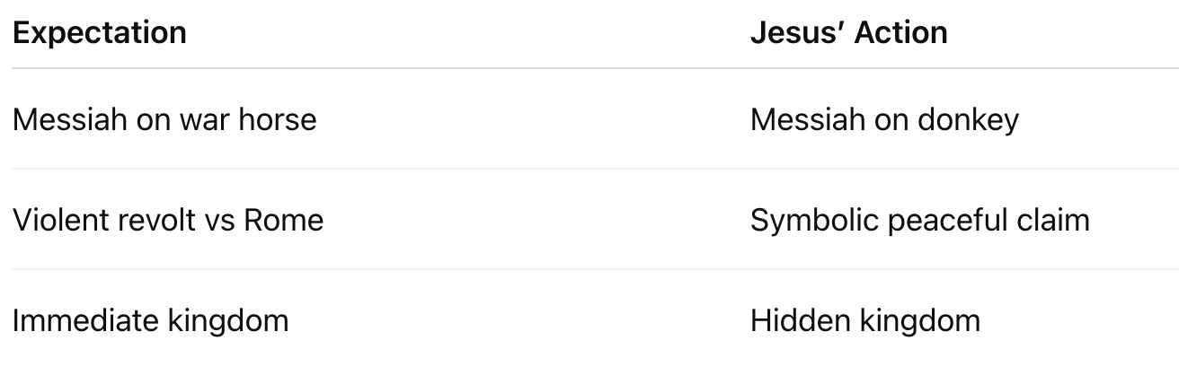 👉 He didn't arrive as a conquering Davidic warrior, but as a peace-bringing king.