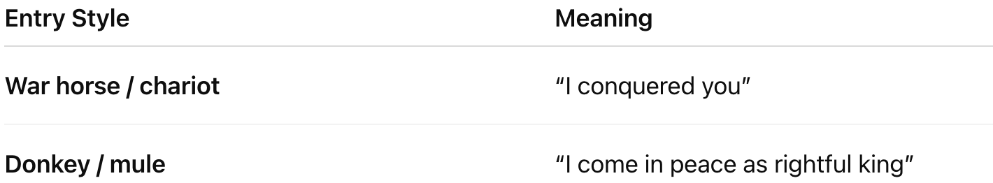In the Ancient Near East (and Roman world), kings signaled their intent by how they entered a city: