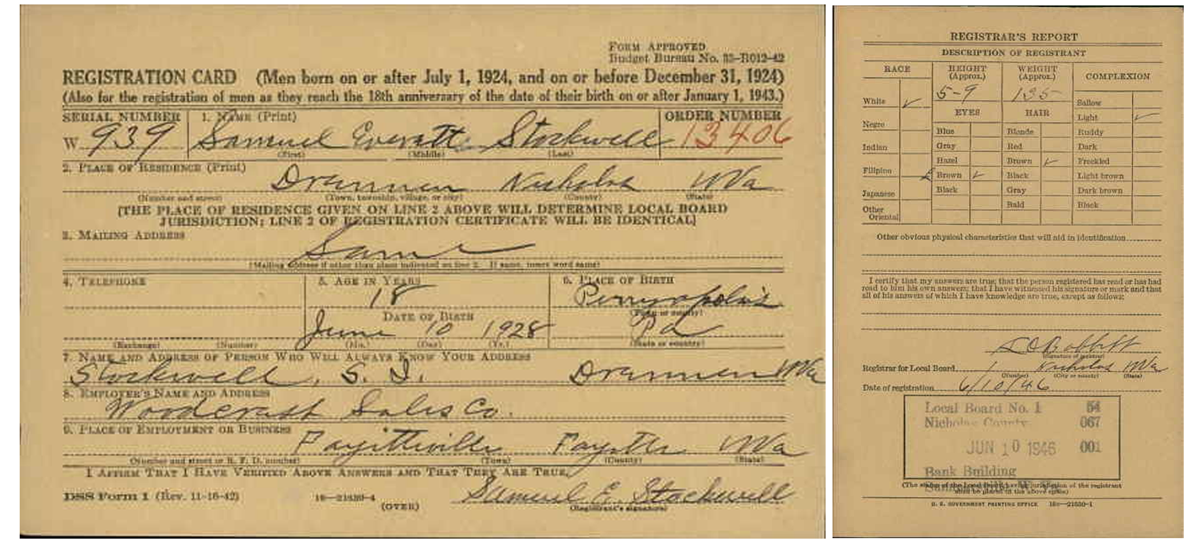 Bio-dad lived in Lorain, Ohio, at some point. When he moved there is uncertain; he was born in Perryopolis, Pennsylvania; his extended family was living in northern West Virginia, Akron, Ohio, and Ypsilanti, Michigan. His draft card (dated June 10, 1946) lists Drennen, Nicholas County, West Virginia, as his legal address when he turned 18.
