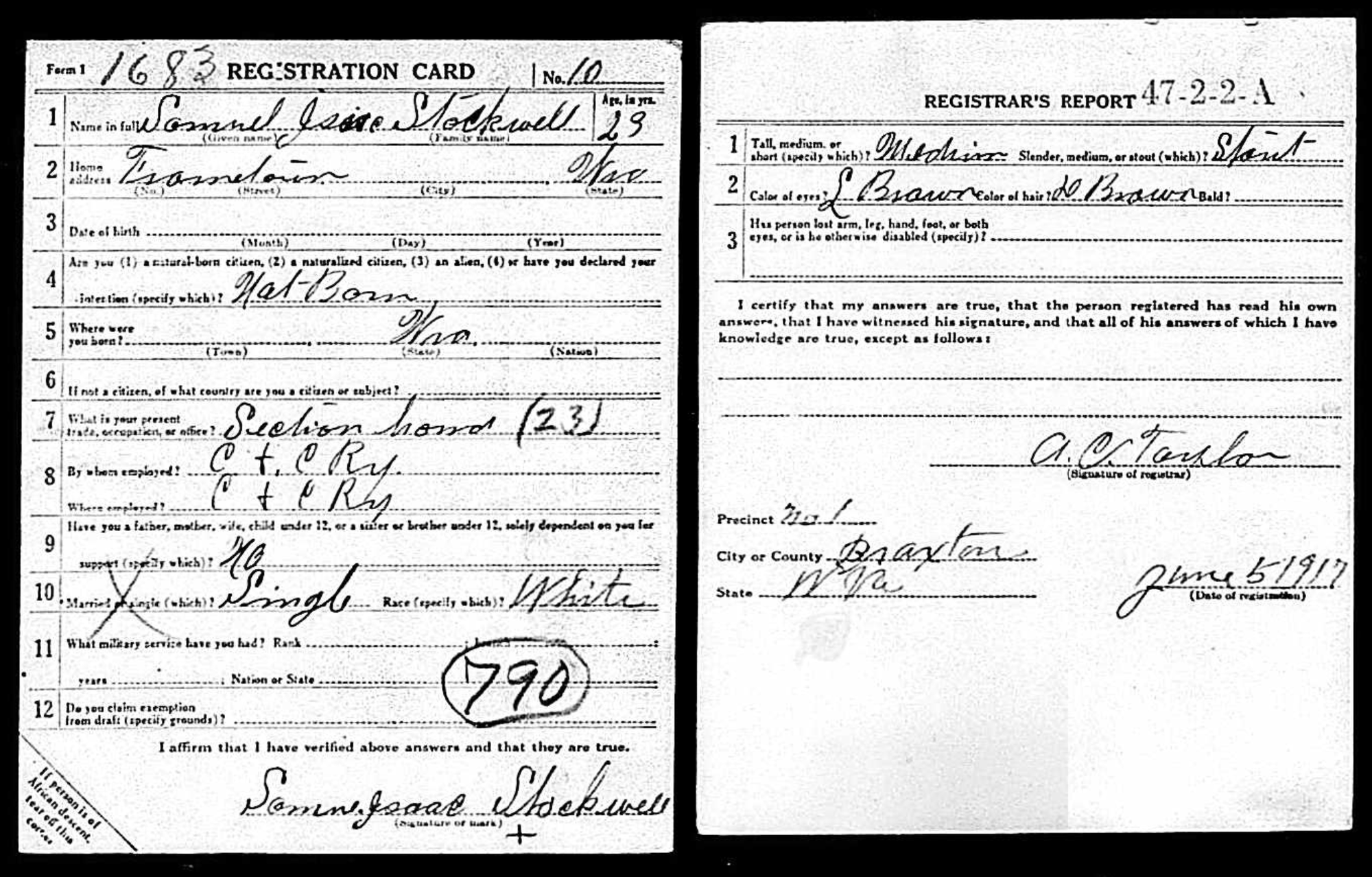 In 1917, he registered for military service as a coal miner in Braxton County, WV.