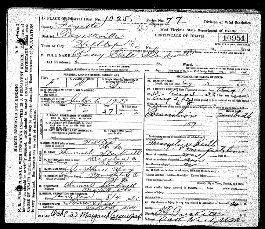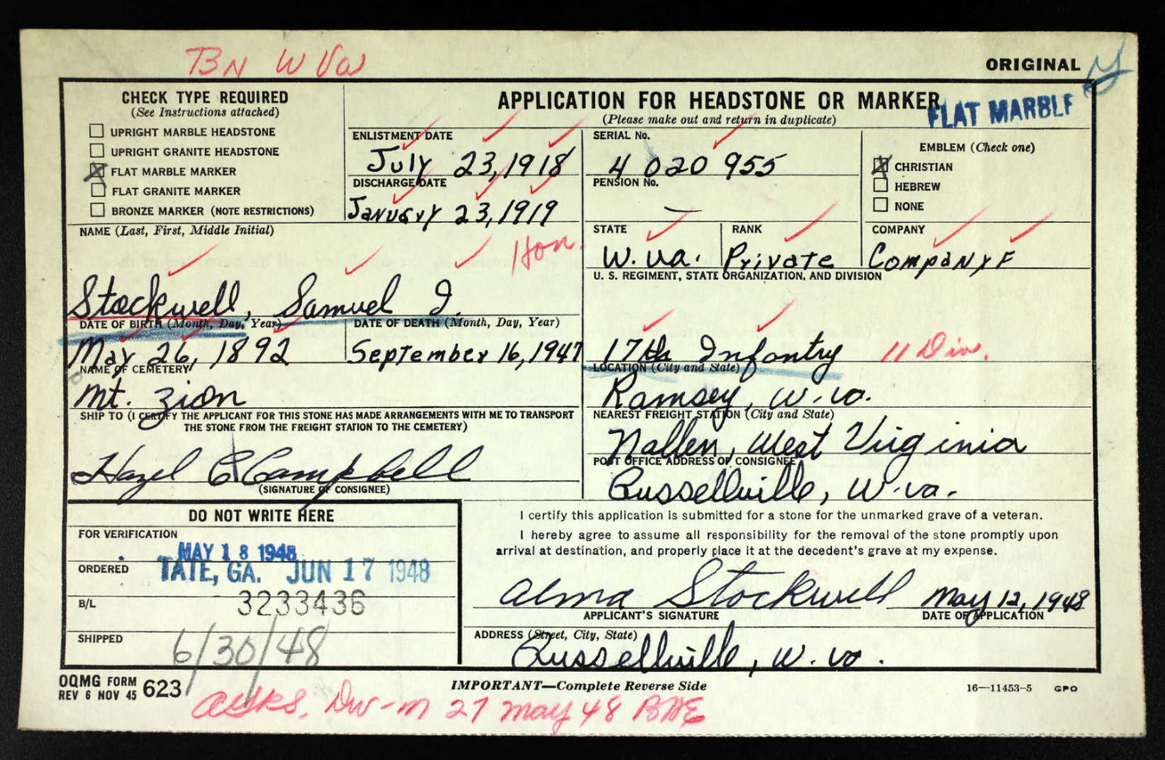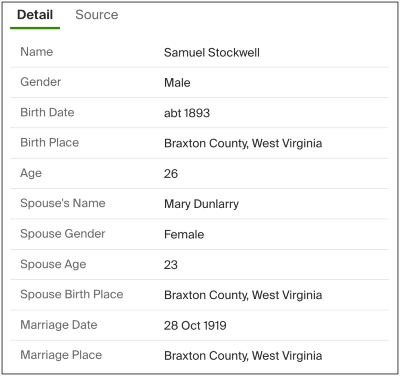 According to marriage records in WV, Sam's father (Samuel Isaac Stockwell) married Mary Dunlarry on October 28, 1919; no one has found anything else on his first wife but that she was born about 1896 in Braxton County, WV. It is assumed she died before the 1920 census was taken.