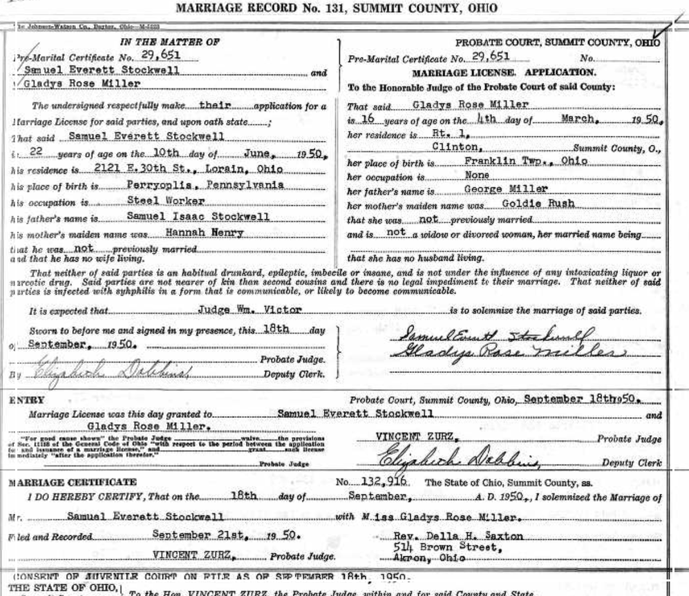 There is a newspaper clipping dated September 18, 1947, indicating he was living in Beckley, WV. In September 1950, he married Gladys Rose Miller, age 16; Sam was 22 years old. Gladys was pregnant with my oldest half-sister, born on October 9, 1950.