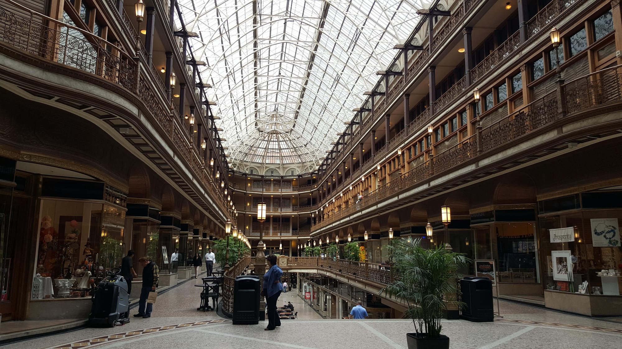 You could walk through the Arcade and take in the sights, smells, and sounds. Specialty shops lined the ground floor. The upper levels were filled with offices of every kind. The roof was made of glass. I remember the toy store on the lower level owned by Mr. Corey who lived next to us on Fitch Road. The little store had every toy you could imagine including the most fascinating marionettes. The Corey girls had several marionettes in their basement; Mr. Corey had built a stage where they would perform for us with them. I always believed no other kid in North Olmsted had such a stage with such neat toys!