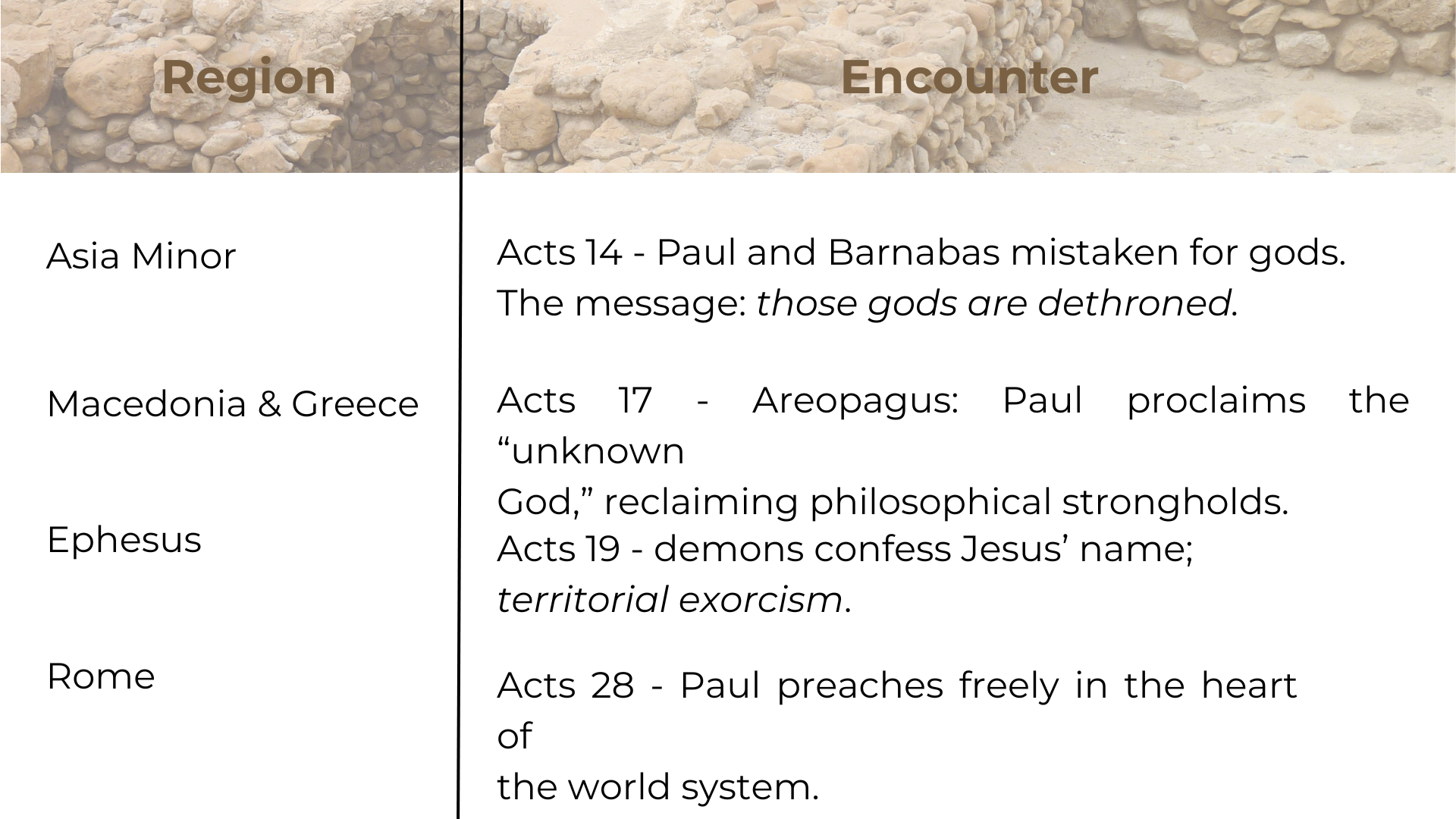 Looking at Acts 14 and beyond, it's not difficult to see the progression of the Gospel. Each city corresponds to a former dominion of rival powers – and each victory narrative shows the gospel's cosmic displacement effect. The lesser gods are dethroned as the "unknown God" is proclaimed. The expansion is amazing especially when you consider the political and religious oppression and opposition from those who rejected the Messaniac message.