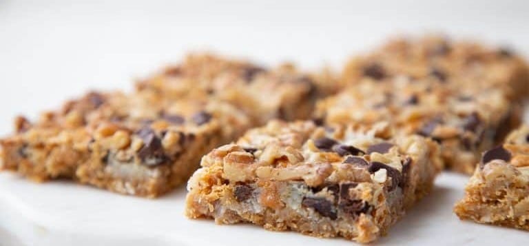 Melt butter in a 9 x 13 pan. Add crumbs and coconut. Press lightly in pan. Cover with a layer of semi-sweet chocolate chips. Sprinkle with layer of chopped nuts. Drizzle sweetened condensed milk evenly over surface. Bake at 350 for 30 minutes. Cool completely before cutting.